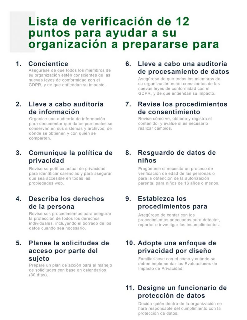 Esta lista contribuye a dar los pasos iniciales para que la gente clave dentro de su empresa esté consciente de la nueva ley, sus características y del impacto que tendrá. Asimismo, recomendamos otros pasos que su empresa deberá considerar en lo referente a documentación adecuada de datos, revisión y actualización del procedimiento actual de recolección de datos, además de la revisión de la forma en que busca, registra y gestiona el consentimiento.